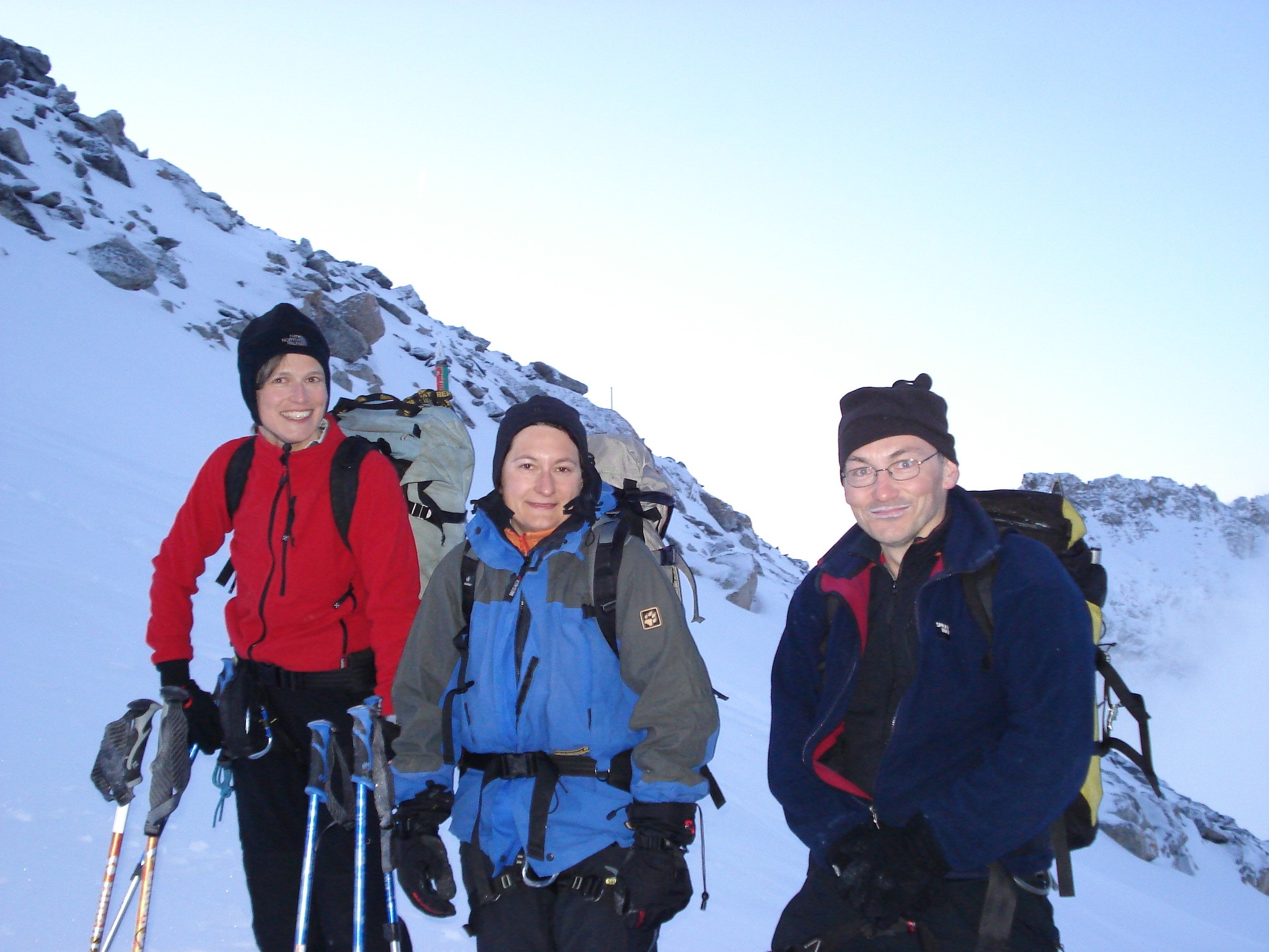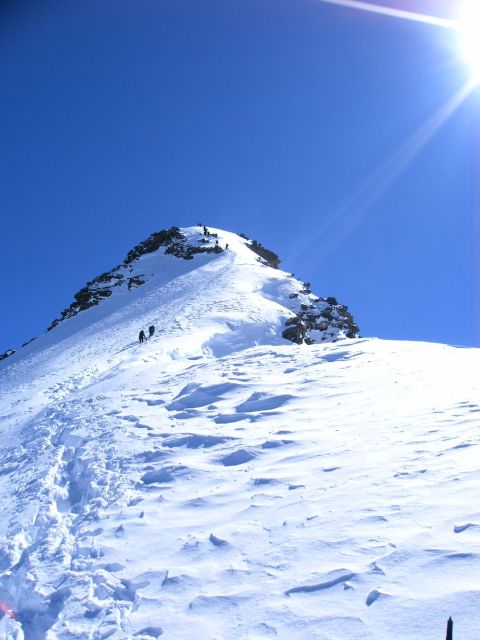 Vom Skidepot aus geht es mit Steigeisen über Firn mit Neuschneeauflage einen ersten Grataufschwung (ca. 45° steil) empor. Anschliessend ein kurzes horizontales Gratstück mit Kraxelei über Blöcke. Der zweite Grataufschwung in Firn ist genauso steil wie der erste nur kürzer. Dann wieder etwas Blockgrat den wir seilfrei gehen. Anschliessend ca. 50 m etwas ausgesetzter Blockgrat den wir zur moralischen Stärkung zum Teil sichern. Den vorletzten, felsigen Grataufschwung geht man in einer Rinne links an (ca. 10 m hoch) . Dort hängt auch ein etwas ausgefranstes Fixseil. Nach etwas Wartezeit - die vorausgegangenen Gruppen kommen jetzt herunter - geht Alex vor und sichert Uta von oben. Im letzten, felsigen Grataufschwung hängt ein dickes Seil wie im Turnsaal. Erik klettert daran hoch und sichert Uta und Alex nach.