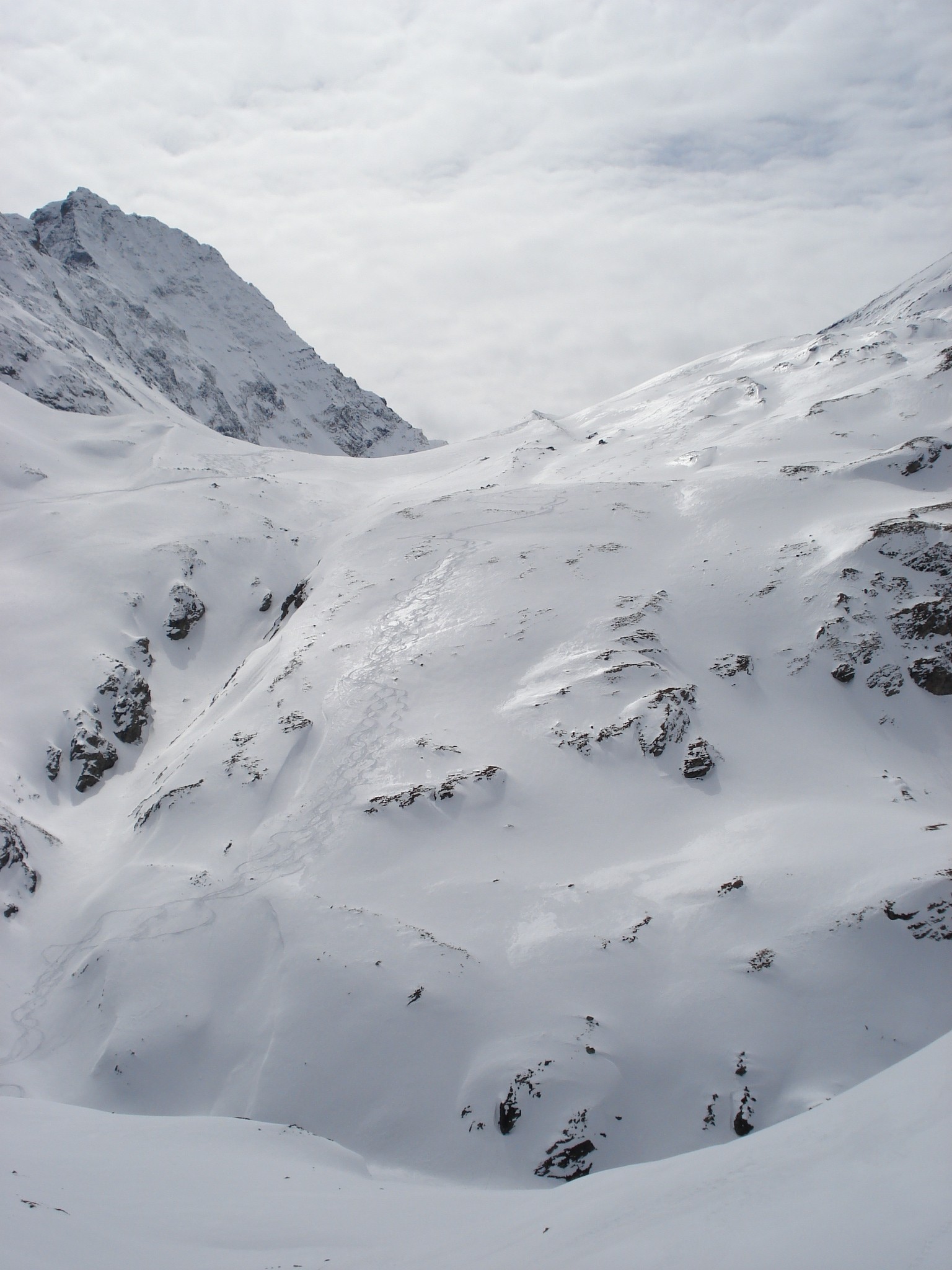 Es geht dann auf den Col de l'Eveque und von dort über den Col Collon auf den Glacier d'Arolla. Unterhalb der Felsen von la Vierge geht es dann ostseitig auf den Col du Mont Brulé zu. Dieser ist verhältnismäßig leicht zu finden, es ist der tiefste Punkt im Grat. Der Col ist unter dem Gesichtspunkt der Lawinengefahr der heikelste Punkt dieses Tages da zum Teil fast 40° steil. Zwischenzeitlich ist auch deutlich mehr Schnee als erwartet gefallen – schätzungsweise ca. 30 cm lockerer Pulverschnee liegen auf einem festen Untergrund. Aufgrund des lockeren, ohne nennenswerten Windeinfluß gefallenen Schnees neigen wir dazu die Einschätzung von Mark und Steven zu teilen und den Hang zu gehen. Einige Leute aus der englischen Gruppe sind aufgrund von Schwierigkeiten in den Spitzkehren etwas langsamer so dass wir die nachdrängenden Gruppen laut um die Einhaltung von Sicherheitsabständen bitten müssen. Insgesamt eine sehr unschöne Situation. Auch wird deutlich dass es bei vielen TourengeherInnen an der notwendigen Technik mangelt.