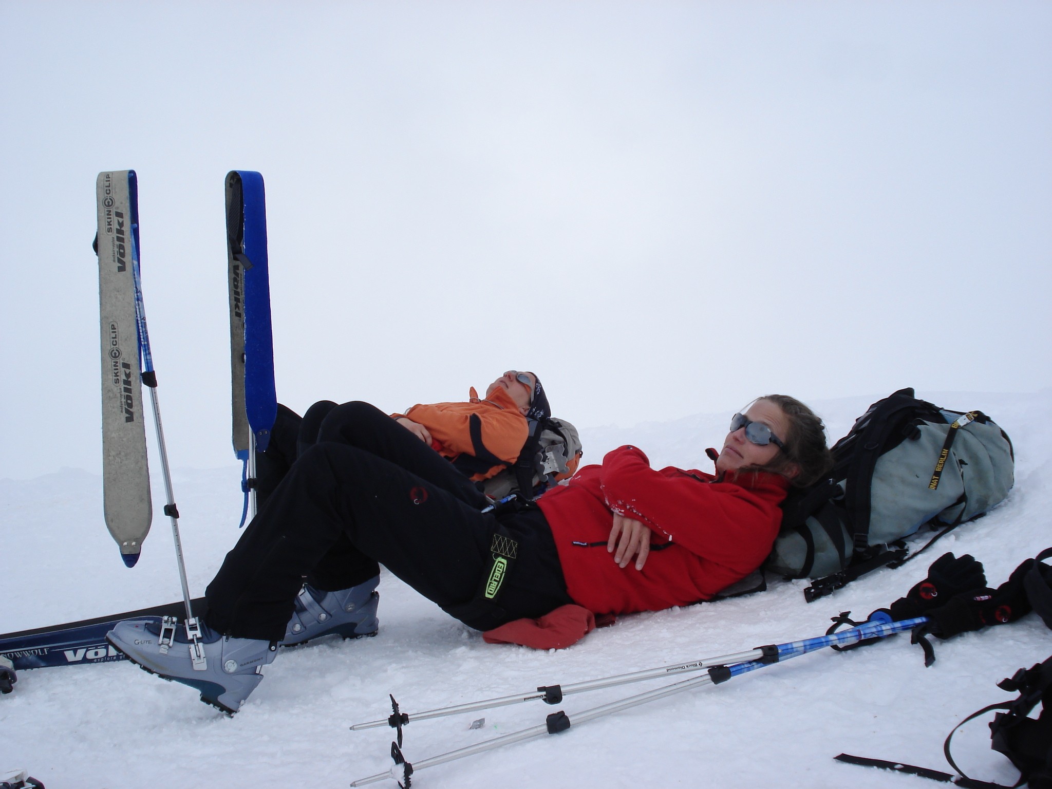 Da wir den nicht einfachen Aufstieg zum Plateau de Couloir lieber an der Spitze der Karawane machen wollen legen wir morgens etwas Tempo vor und sind auch die Ersten die losgehen. Zuerst geht es über mäßig steile Hänge aufwärts. Als es beginnt aufzusteilen verliert Alex ihr Harscheisen und muss über 50 Höhenmeter unter heftigem Fluchen abfahren (Dabei sollte sie noch froh gewesen sein dass das Ding unten liegen blieb anstatt verlorenzugehen). Mit viel Wut im Bauch und vielen Schimpfworten schafft Alex es dann auch noch vor den anderen Gruppen wieder bei uns zu sein – nur die netten Schweizer sind an uns vorbeigezogen was sich aber noch als Glücksfall herausstellen sollte.