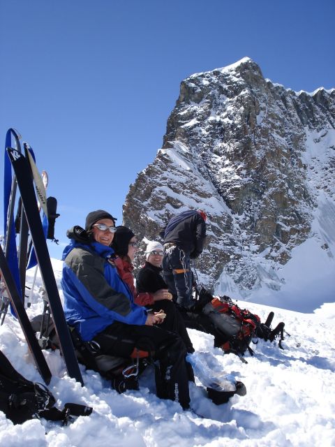 Nach kurzer Rast fahren wir über einen schön steilen ostseitigen Hang auf den Glacier de Sonardon ab. Mit kurzem Gegenanstieg zum Col de Sonardon. Von dort bietet sich eine Querung zum Grand Tete de By (3587m) an. Dieser präsentiert sich mit einer prächtigen Aussicht von Weisshorn, Matterhorn bis Monte Rosa als toller Aussichtsberg. Diese Berge wollen wir in den nächsten Tagen erreichen und mit der Besteigung der Duforspitze die Tour krönen. Mal sehen obs klappt.