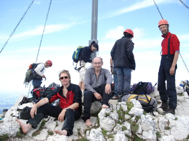 Die Aussicht von oben ist sehr schön. Auf der einen Seite fällt der Westgrat sehr imposant ab – auf der anderen Seite ist Schloss Neuschwanstein und das Wettersteingebirge mit der Zugspitze zu sehen. Die Füsse tun auch schon ein bisschen weh und so machen wir eine längere Gipfelrast. Eine andere Seilschaft, die wir unten in der ersten Seillänge getroffen haben kommen über die „Alte Südwand“ herauf. Nach dem Gipfelfoto steigen wir gemütlich ab und sind mit den ersten Regentropfen an der Tannheimer Hütte. Nach kurzer Einkehr steigen wir dann ab und fahren nach Karlsruhe zurück.