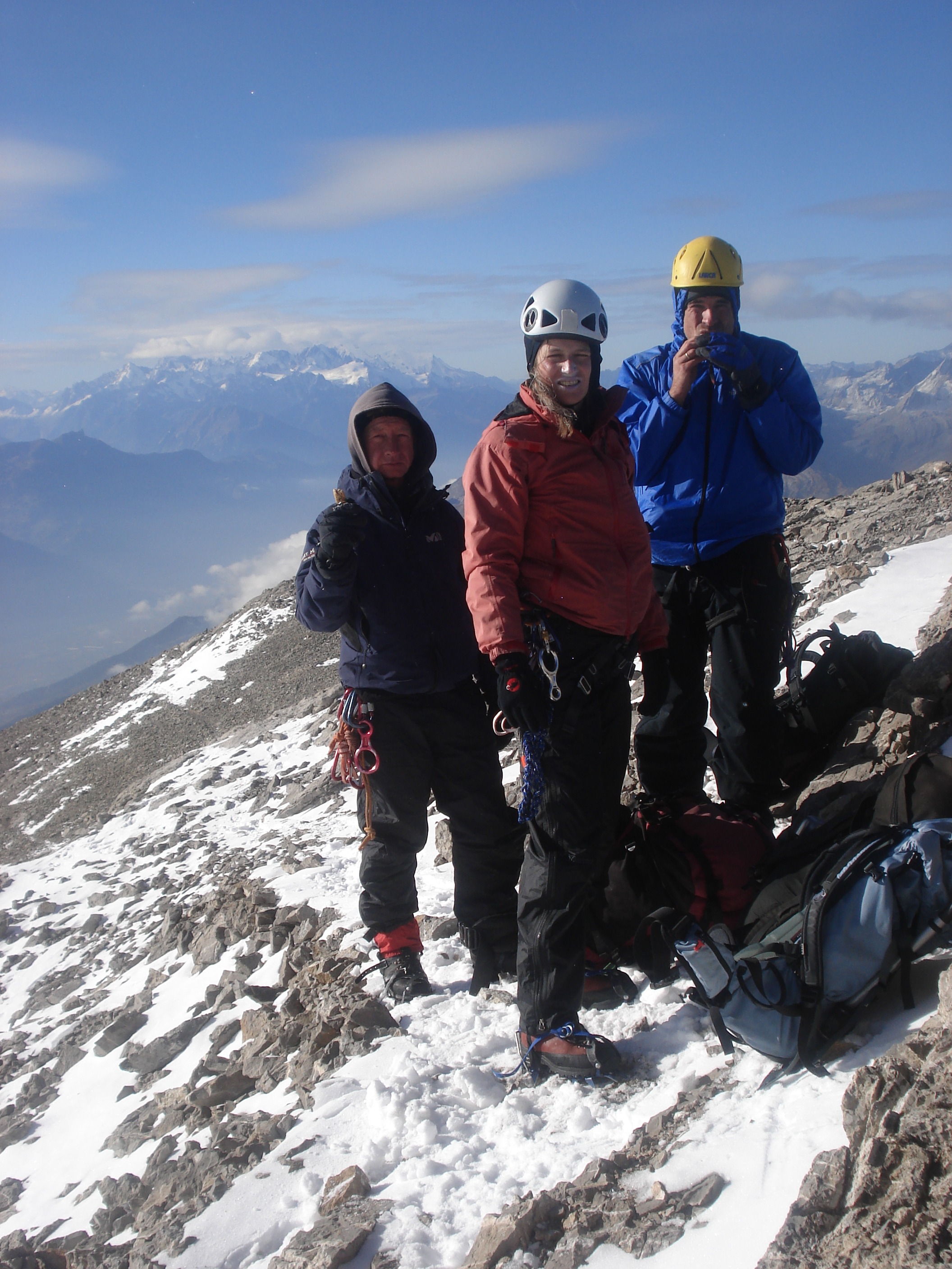 Morgens ist der Weg nun kein Problem mehr – bis zum Col du Brochet ists der gleiche wie gestern. Die Steigspuren in der Westflanke sind leicht zu finden und links von dem gelben Felsen geht es dann über leichte Kletterei hinauf. Das obere Band entlang ein Stück nach links und die anschliessende Rinne empor über teils dick vereiste Stellen bis zu der Abseilstelle (Stahlkabel um Block). Nun über bröselige Felsen hinauf auf den Grat wo uns die Sonne erwartet und ein windärmeres Plätzchen zur Rast einlädt.