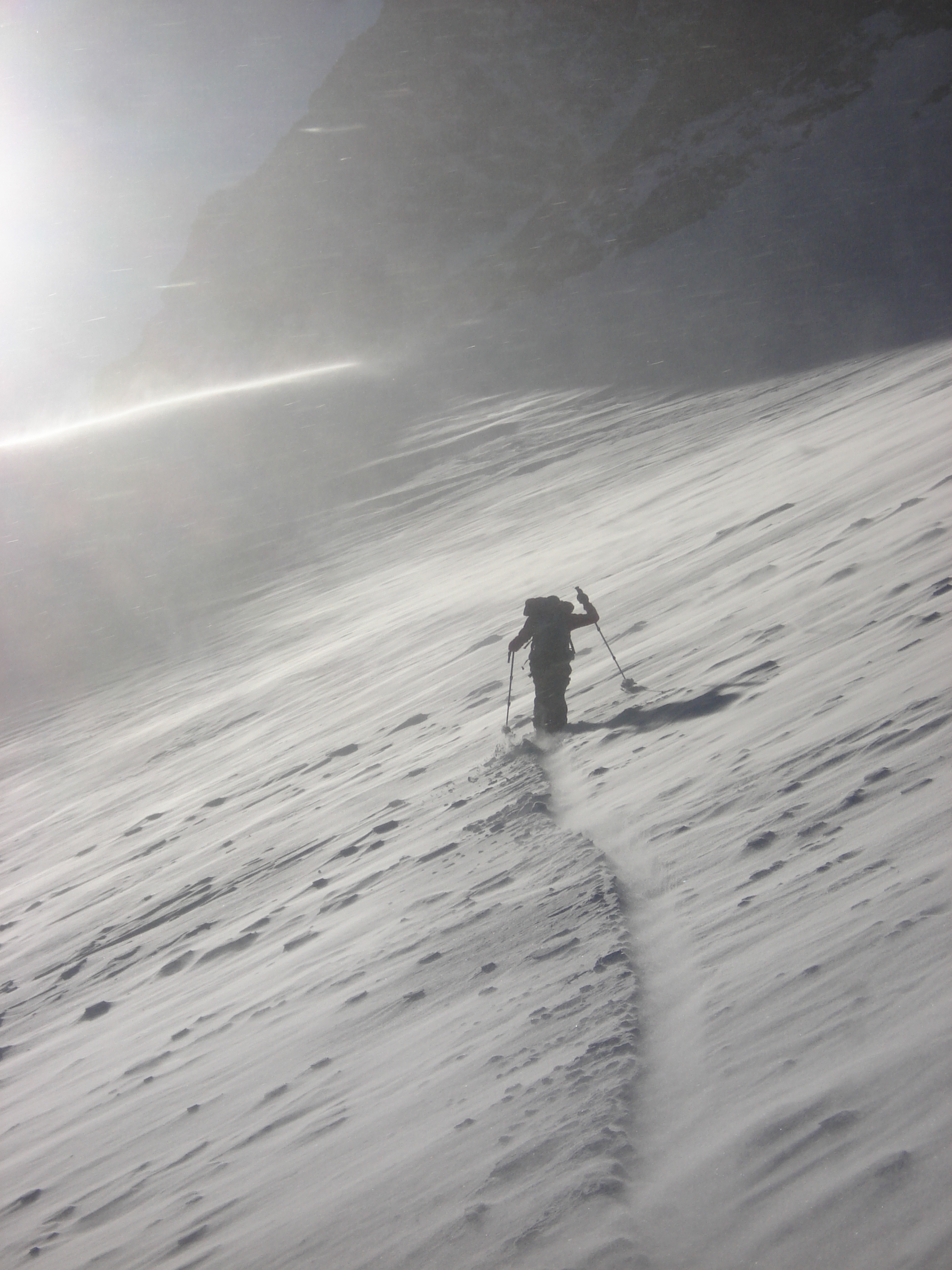 Die Abfahrt ist wie zu erwarten schwer im wingepressten Schnee. Weiter unten ist dann etwas schieben angesagt und wir fellen noch einmal an in den Talboden unterhalb der Hütte abfahren zu können. Von dort aus geht es dann zügig abwärts. Der schöne Pulver von gestern ist leider inzwischen windverblasen so dass der Abfahrtsgenuss zuerst auf der Strecke bleibt.