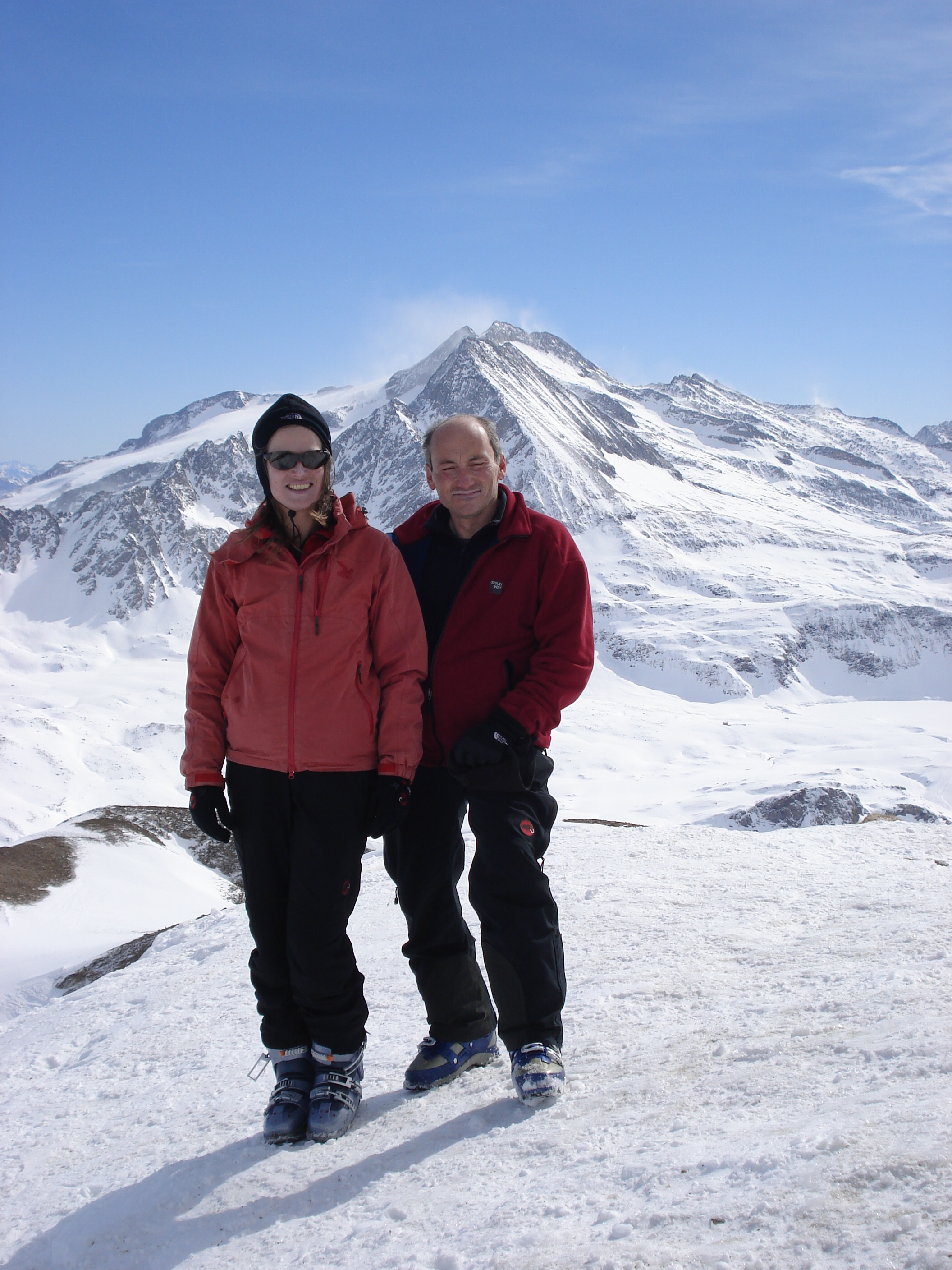 Am Fuss des östlichen Gipfelhangs treffen wir noch eine lustige italienische 3er Senioren-Gruppe die sich über unsere Spur freuen. Oben am Gipfel finden wir ein windgeschütztes Plätzchen und ein Gipfelfoto mit uns zweien ist dann den Italienern auch drin. Insgesamt sind wir 5 an dem Tag wohl die einzigen auf dem Helgenhorn. Beim Blick nach Osten hinunter sind aber ein Haufen Leute im Anstieg auf den Sattel zwischen Helgenhorn und Punta die Valrossa – das ist auch eine sehr schöne Abfahrt. Eine Gruppe ist auch im Anstieg auf die Punta di Valrossa zu sehen.