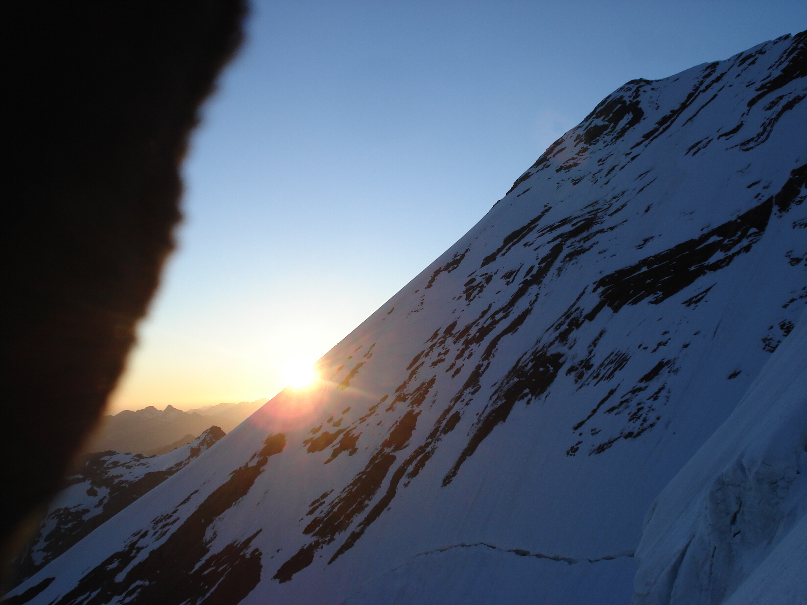 Frühstück ist recht früh angesagt, immerhin haben wir Sommersonnenwende und die Sonne wird recht früh da sein. Die Erkältung hat sich anscheinend durch kräftig erschreckt und ist fast weg – prima. Der Himmel ist sternklar aber es ist brühwarm und die Frage ist ob die nächtliche Abstrahlung ausgereicht hat. Mal sehen. Um die 4 Uhr gehen wir los, im Bereich der Hütte ist der Schnee noch weich und nur ganz schwach überfroren. Knapp eine Stunde später sind wir am Wandfuss wo wir hinter drei französischen Gruppen einsteigen. Der Schnee ist hier deutlich fester – zwar weich aber nicht sulzig.