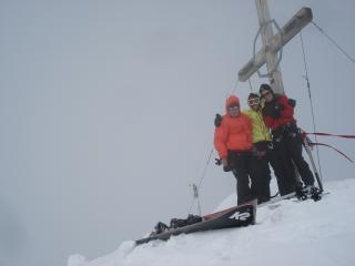 Die Spurerei durch den weichen Schnee ist anstrengend, in den flachen Mulden wird es sehr zäh und beginnt mächtig zu stollen. Das Wetter ist nicht extrem schlecht - gelegentlich machen die Wolken auch einmal ganz auf. Weiter oben steilt es dann etwas auf und hier wird der Schnee auch etwas fester. Mit einigen Kehren im Steilgelände kommen wir dann auf den Glatscha da Gliems. Hier etwas nach Osten queren und dann immer zwischen den Felsen hinauf. Gegen Ende wird es dann sehr steil mit hartgefrorenem Firn und Skitragen ist angesagt. In der Porta da Gliems pustet der Föhnsturm wie eine Düse hindurch, leider ist die Sicht wieder deutlich schlechter geworden.
