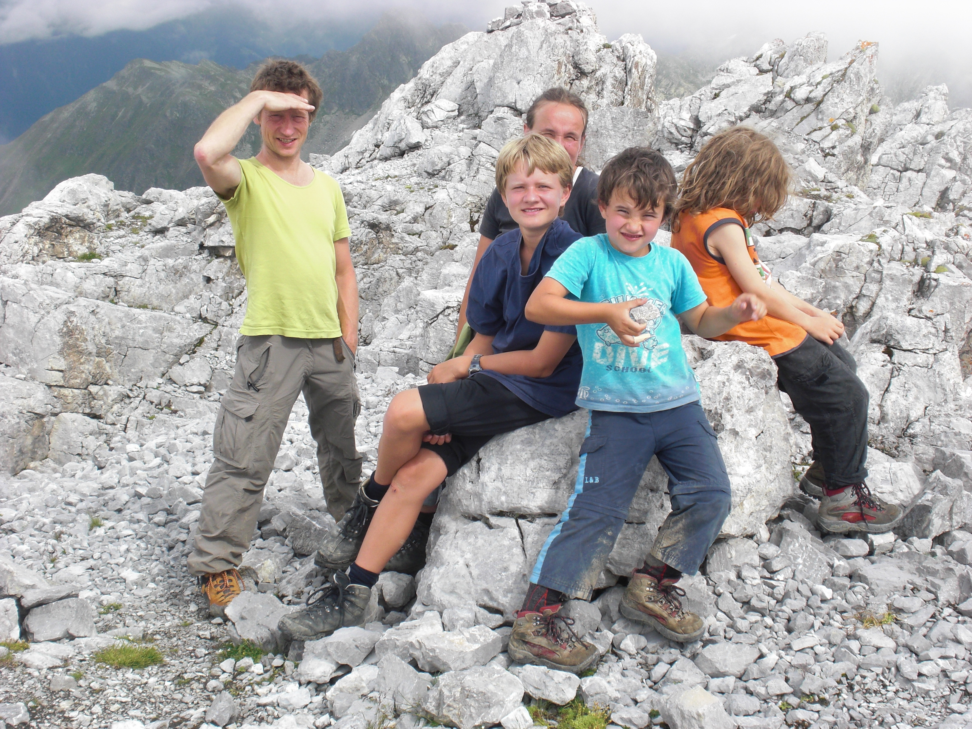 Auch heute starten wir alle gemeinsam und wollen mit der Schesaplana einen weiteren hohen Gipfel machen. Zum Glück sind es nicht so viele Höhenmeter – dafür haben wir aber umso mehr Gesellschaft. Es geht unschwierig über einfaches Gelände hinauf. Unterhalb des Gipfels finden wir dann noch Kristalle was angesichts des latent steinschlägigen Geländes nicht ganz optimal ist. Der Gipfel ist dann auch gleich erreicht und wir können auf den für die Kinder doch sehr imposanten Brandner Gletscher hinunter gucken. Einzig der große Besuchestrom ist nicht ganz so schön - man merkt daß der Gipfel über die Seilbahn am Lünersee doch sehr einfach zu begehen ist. Also steigen wir wieder ab, natürlich nicht ohne noch den einen oder anderen Kristall zu suchen.