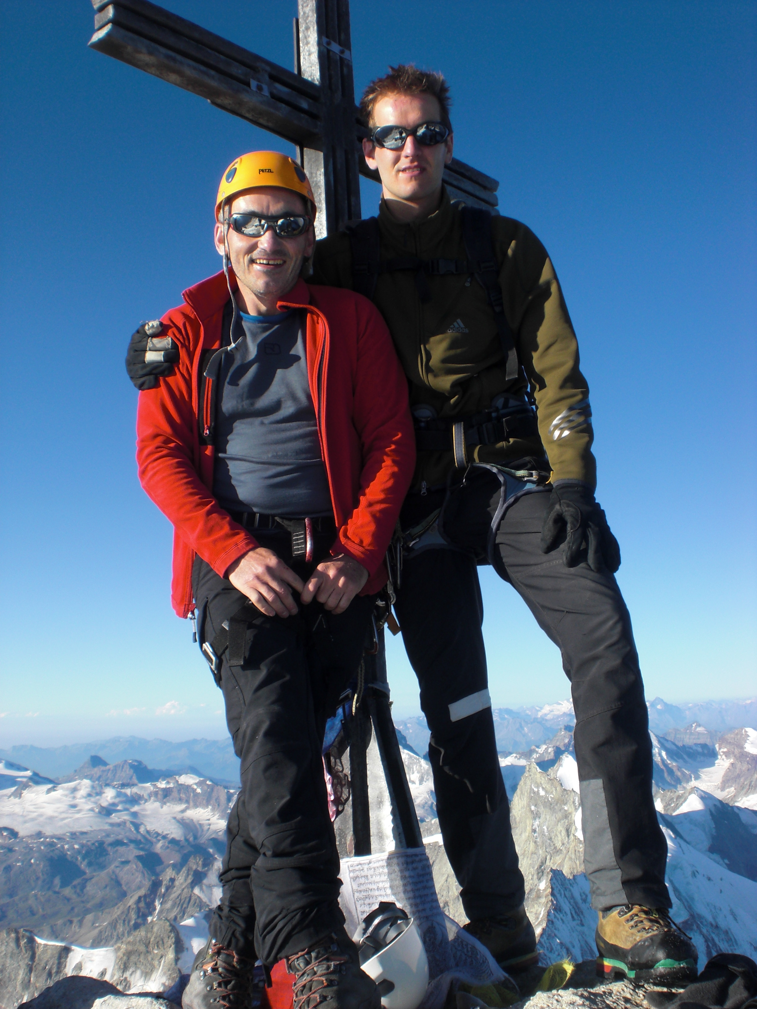 Um ca. 8 Uhr treffen wir am Gipfel auf die ebenfalls ersten Seilschaften die über Nordgrat und Schaligrat hinaufkommen – dieses zeitgleich Eintreffen ist eine interessante Situation. Insgesamt waren wir jetzt nur knapp 5 Stunden unterwegs was aber bei den guten Verhältnissen aber auch nachvollziehbar erscheint. Das Wetter hat sich prima gehalten – bis auf den Dunst über der Po-Ebene zeigt sich keine Wolke am Himmel. Es ist windstill und warm. Der Nordgrat ist ganz gut einzusehen und lädt richtiggehend ein. Der Schaligrat versteckt sich etwas, jedoch ist das Biwak vom Gipfel aus zu sehen.