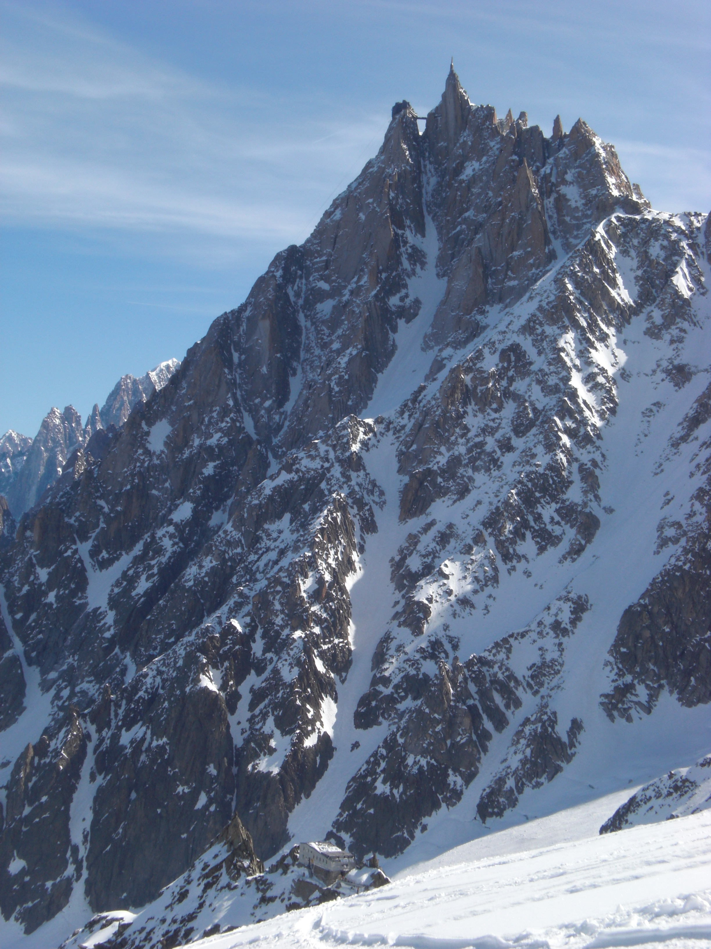 Bald sind wir auf der Höhe der Hütte wo der Schnee dann etwas leichter zu fahren ist. Das letzte Stück über Jonction hinunter ist kein Problem und gegen halb zwölf sind wir unterhalb der Aiguille du Midi und fellen wieder an.