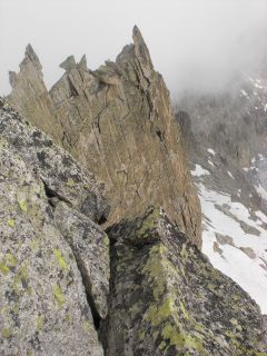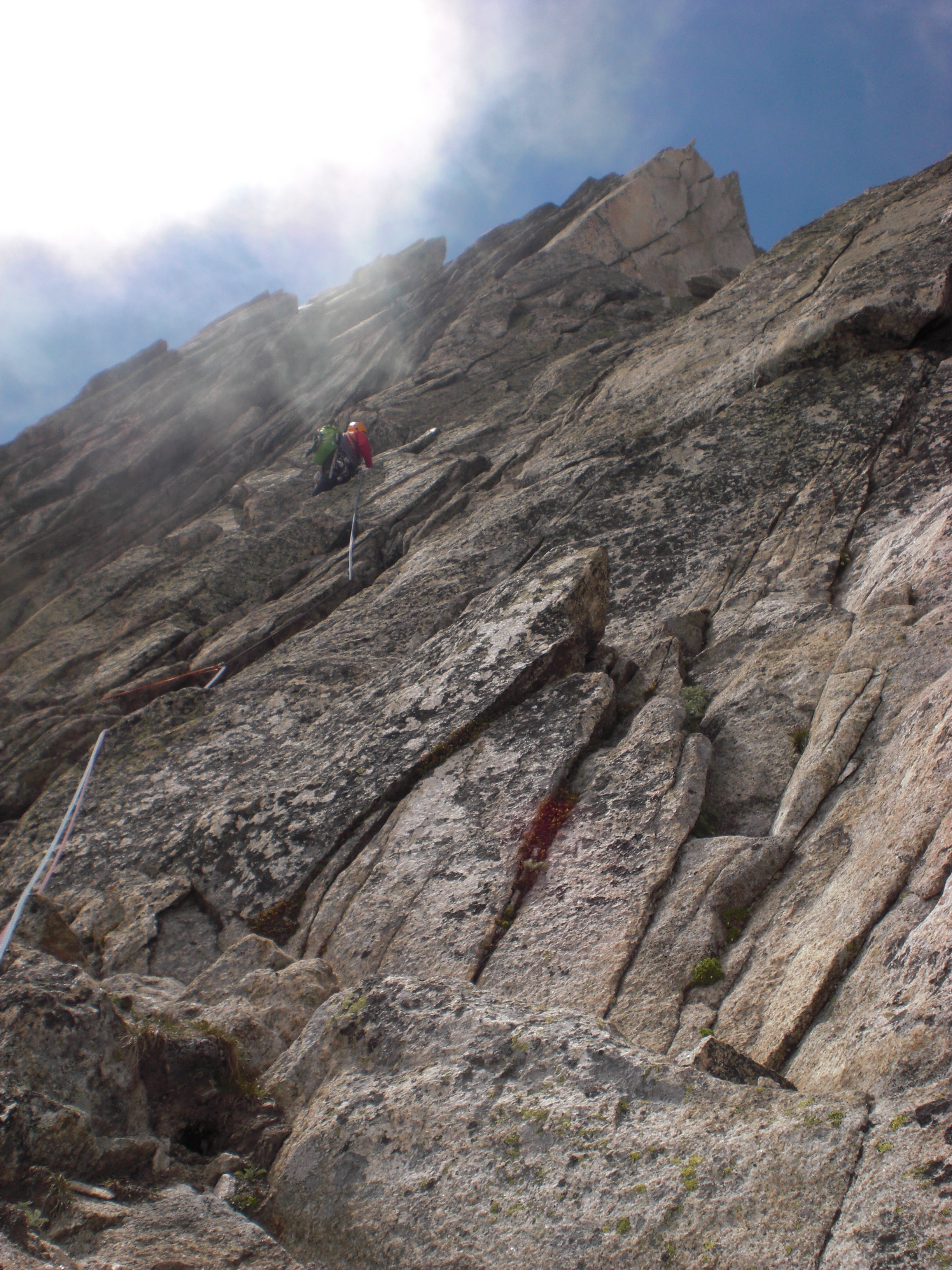 Es schliessen sich einige leichtere Seillängen an. Die Routenfindung ist nicht einfach bzw. es sind einfach verschiedene Routen möglich was auch so im Führer vermerkt ist. Nach einem Ausflug ins leichtere Gehgelände rechts vom Grat gehen wir wieder auf den Grat zurück der uns mit ein einigen netten Seillängen auf den Vorgipfel führt. Einen Turm umgehen wir dabei links. Einige Seillängen gehen wir dabei auch zusammen am Seil mit laufender Sicherung über Zackenschlingen. Zum Glück haben wir einige Bandschlingen dabei so daß wir einiges gehen können bis das Material verbraucht ist. Bis auf die ersten 4 Seillängen sind im wesentlichen keine Haken oder Standplätze vorhanden.