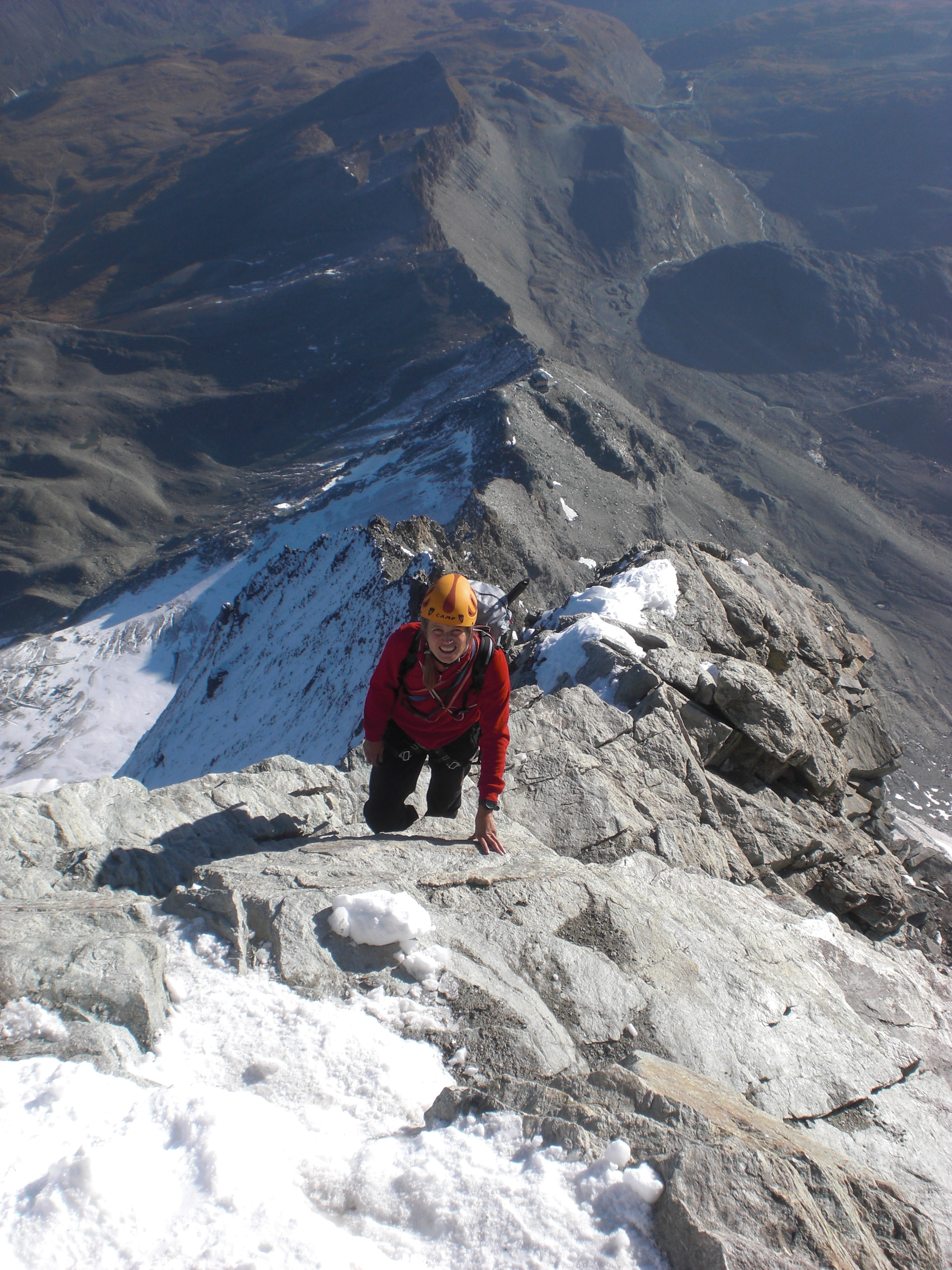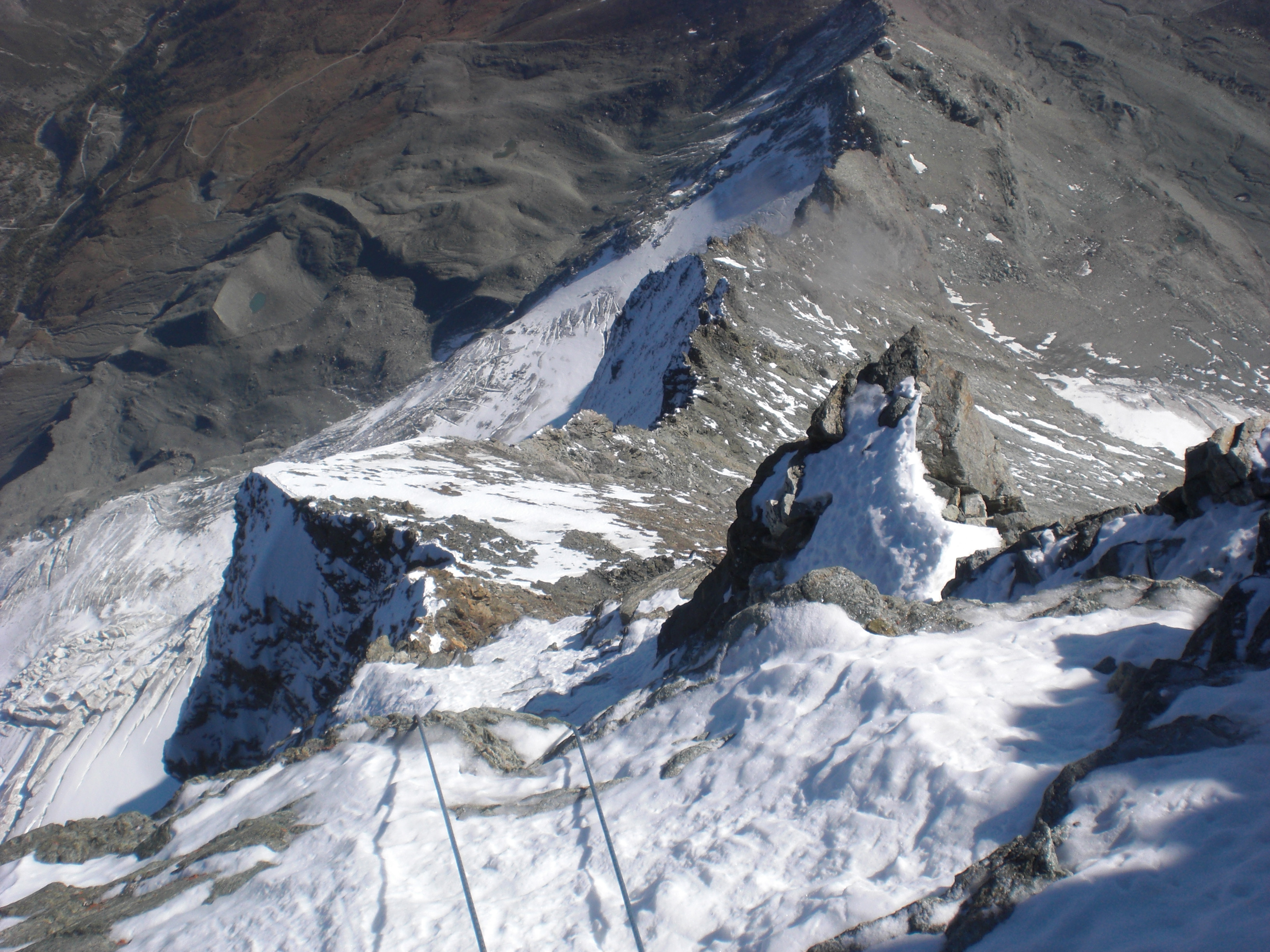 Fazit: Überraschenderweise war die Kletterei am Matterhorn sehr schön – im Bereich der Route war der Fels auch sehr fest. Man muss zügig unterwegs sein um von der Zeit her im Rahmen zu bleiben, besonders bei fortgeschrittener Jahreszeit. Andererseits hätten wir die Tour auch nicht zur Hüttensaison gemacht, dazu fanden wir die Tourenberichte die wir dazu gelesen haben viel zu gruselig. Aber so war es dann genau richtig. Insgesamt waren auf dem Gipfel an diesem Tag nicht mehr als 5 Seilschaften.