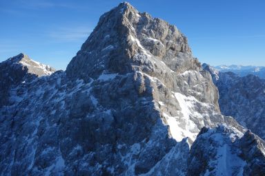Morgens ist der Himmel zunächst bedeckt. Wir starten gegen 9 Uhr. Auf der äußeren Hölltalspitze sind wir schnell. Von dort geht es dann im selben Auf und Ab wie gestern weiter. Hinauf zur Vollkarspitze geht es in steilem Aufschwung über Tritte und Stahlseile, die man aber erst einmal anklettern muss. Nach der Vollkarspitze quert man den Hochblassen nordseitig. Die oft lawinengefärdete Querung ist diesmal kein Problem. Die Schneedecke ist nur gering und es sind nur kleinere zusammenhängende Schneefelder vorhanden. Nach der Querung geht es eine Rinne schräg nach oben in eine Scharte, von dort ist man dann schnell unschwierig an der Grießkarscharte. Dort machen wir eine kleine Pause und warten bis uns eine 3er-Gruppe erreicht die den Grat von der Alpspitze aus machen wollen und Richtung Biwak weitergehen. Wir ziehen dann auch los und machen uns auf das letzte Stück unschwierigen Weg zur Alpspitz.