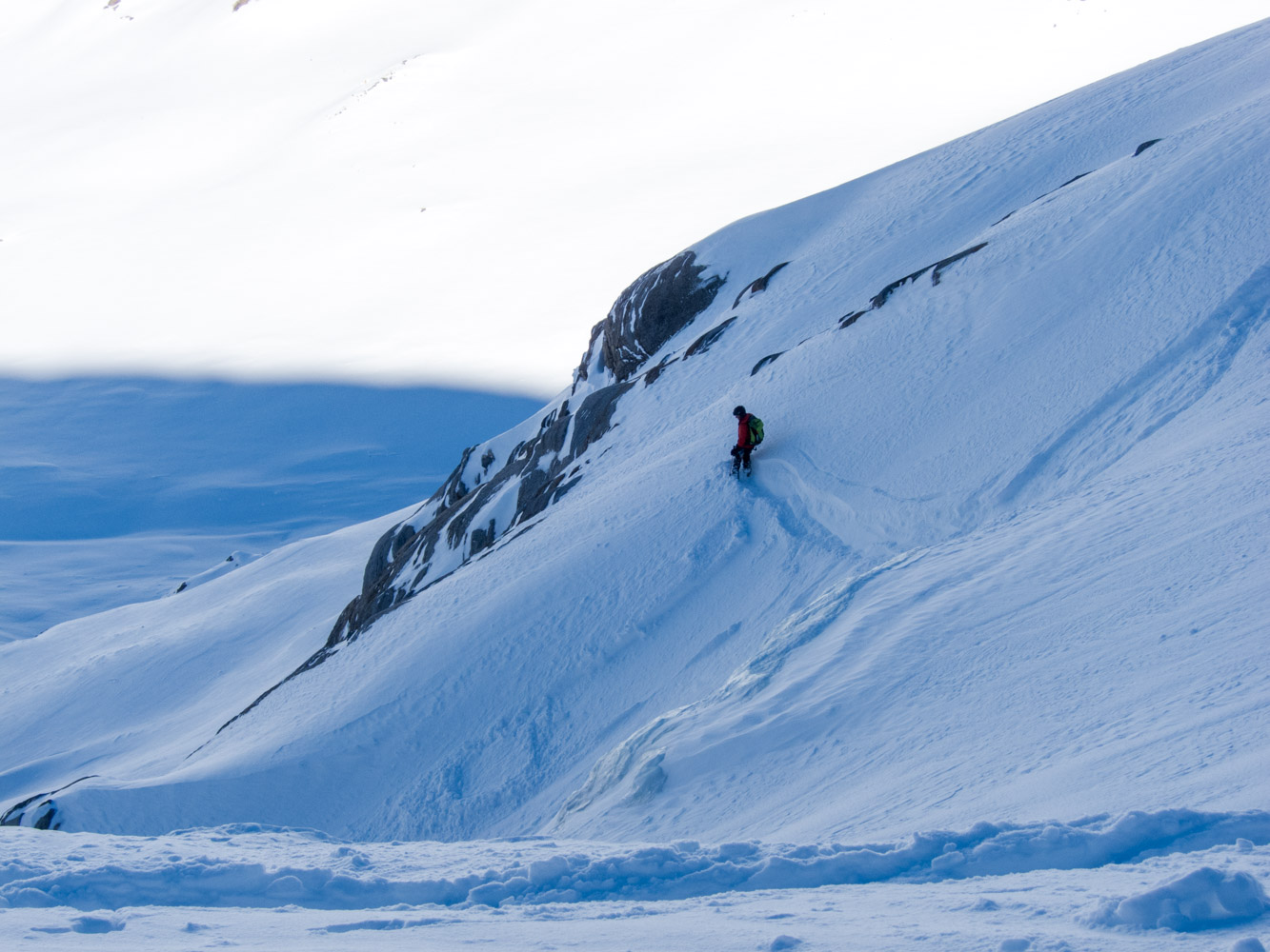 Es gibt einige kleine Kletterstellen und zusammen mit der lockeren Schneeauflage ist der Aufstieg nicht ganz einfach und man ist froh über die gelegentlich vorhandenen Bohrhaken und Sicherungsstangen. Nach 4 kurzen Seillängen wird der Grat aber deutlich einfacher und man kann im Trittschnee bis zum Gipfel stapfen. Retour nehmen wir dann den abgekürzten Grat und seilen in zwei Seillängen mit einer Sicherungsstange als Zwischenstand ab.