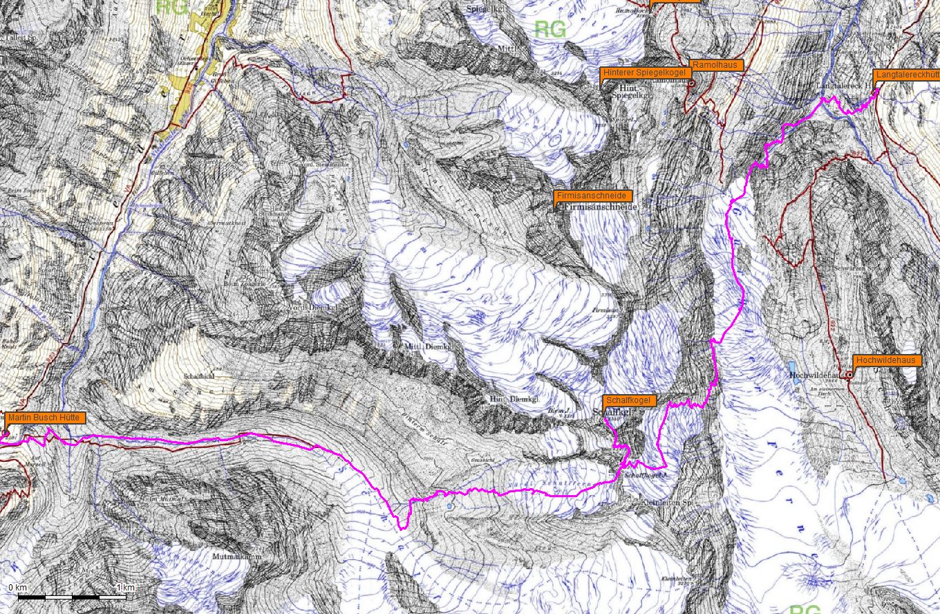 Zur Abfahrt queren wir dann den steilen Nordosthang und fahren dann über eine flachere Rampe den Osthang ab, bis wir auf ca. 3140m in die Nordwestflanke einfahren können. Dann immer nach Norden bis man eine Rippe überqueren kann und so auf den Mittelteil des Hangererferners gelangt. Nun halten wir uns nicht zu tief und gelangen so auf einer Höhe von 2700m auf die Route vom Eiskögele. Dieser folgen wir dann bis ins Rotmoostal. Manche machen noch einen Einkehrschwung in der neuen Schönwieshütte.