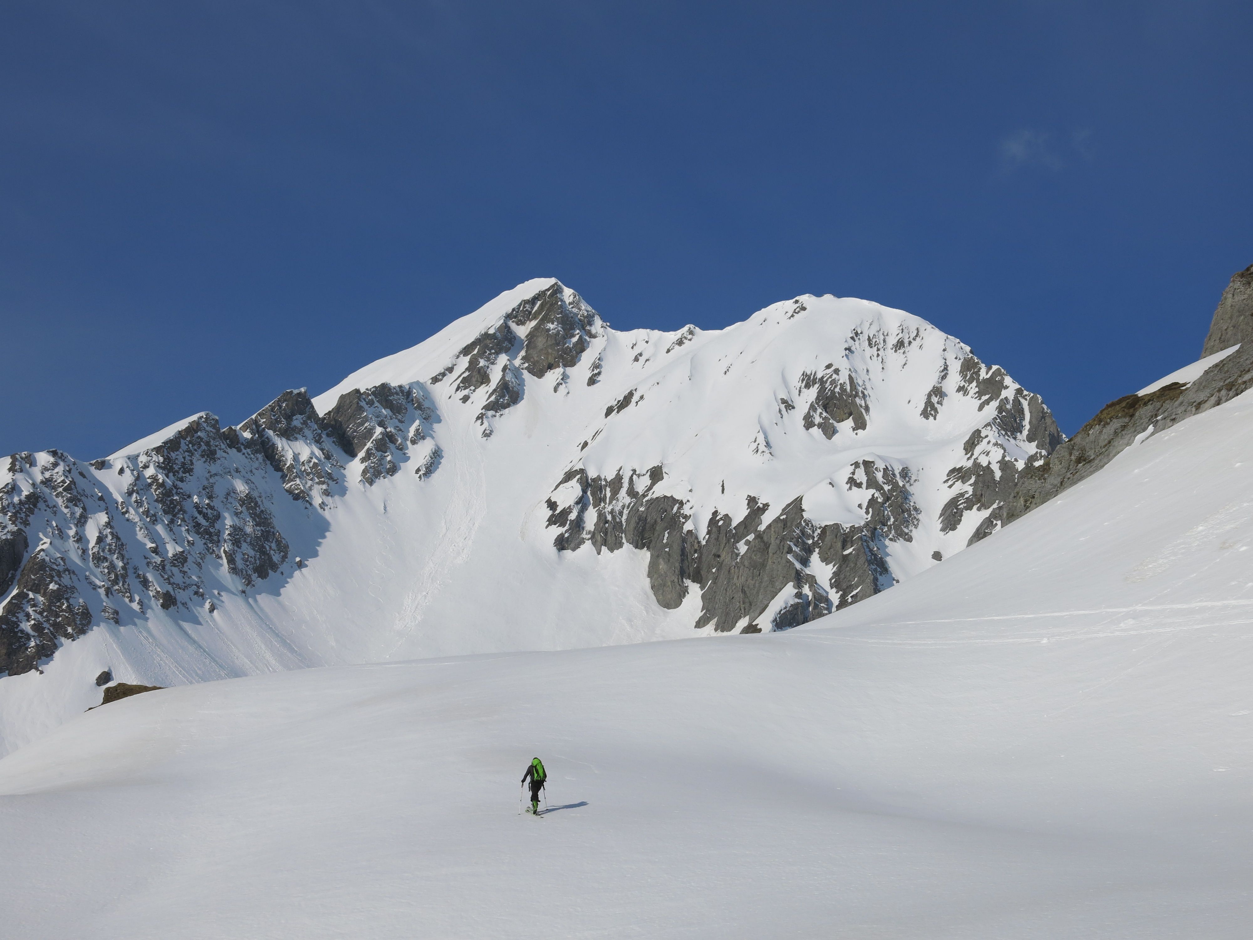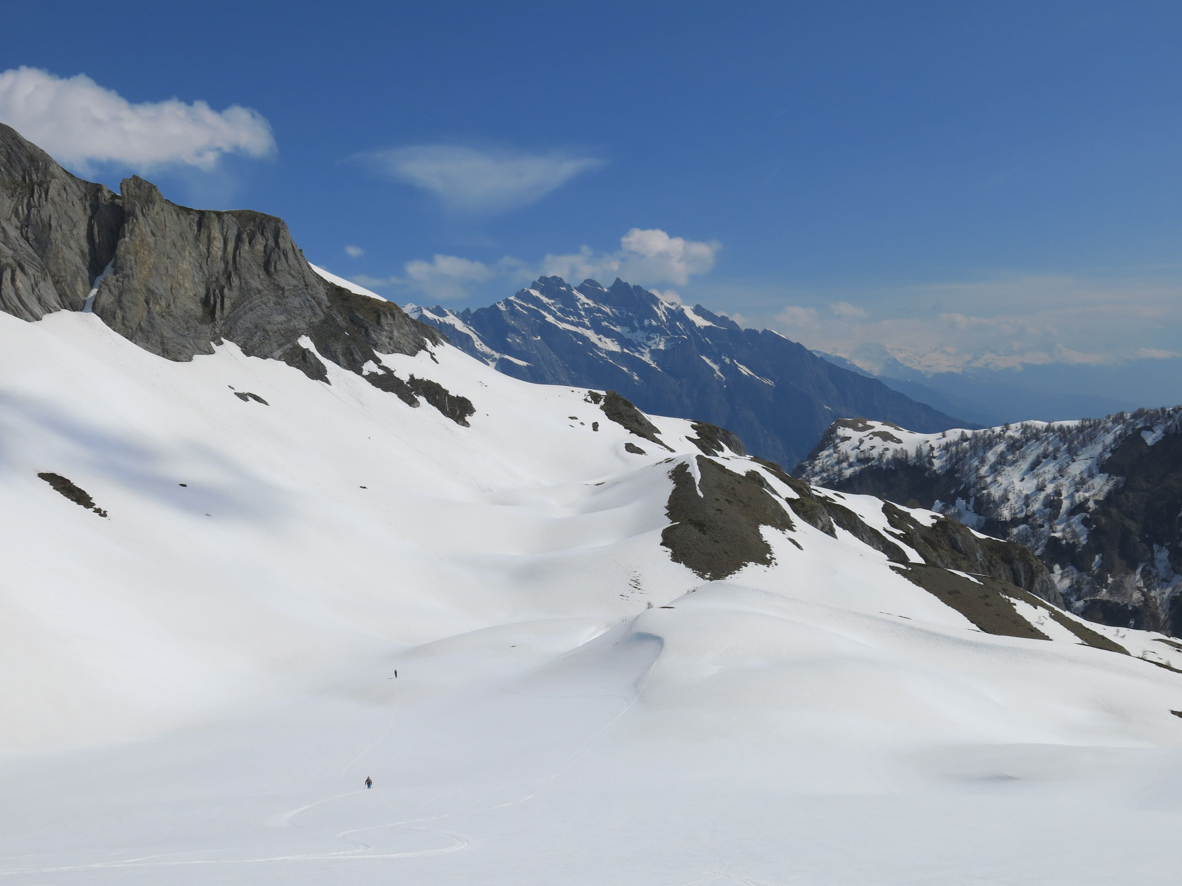 Diesmal strebten wir als Gipfelziel den Nordgipfel des Grand Chavalard an. Kurz nach dem Losgehen hatten Erik und Flo einen Lifer (so nennen Ornithologen die im Leben erstmalige Sichtung einer Art), den Bartgeier. Für mich war es ein Retick (so nennen Ornithologen die wiederholte Sichtung einer Art: Tick ist das Häkchen an der Artenliste.). Beglückt durch dieses Erlebnis schossen wir jugendhaft dem Ziel entgegen, unterstützt durch das etwas unangenehme innere Gefühl, das die schon um 10 Uhr sehr weiche Schneedecke auf teils sehr steilen NO-Hanglagen in uns auslöste. Sonst lösten wir nichts aus, verzichteten aber daraus folgernd auf den Gipfel und schossen ebenso jugendhaft aus den Hautes Fenêtres wieder hinab.